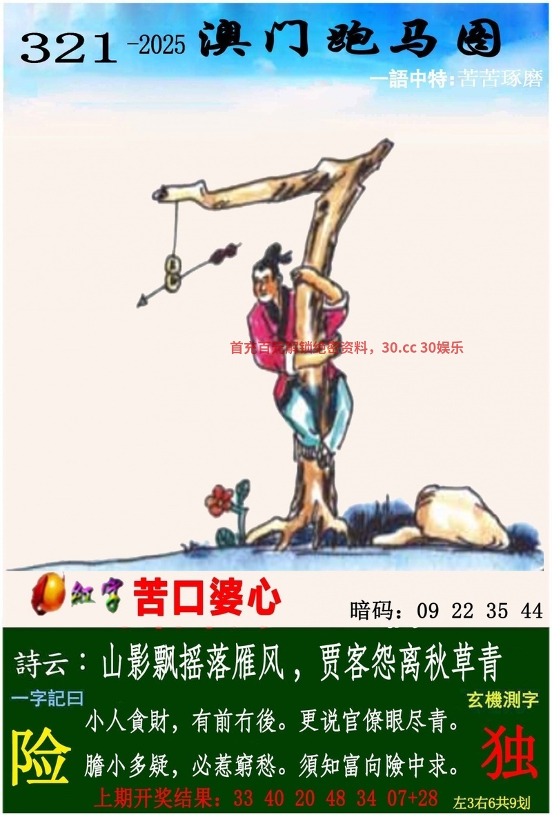 321期一字記曰:【险】 小人貪財,有前冇後。更说官僚眼尽青。膽小多疑,必惹窮愁。須知富向險中求。【独】 解:小人貪財,有前冇後。更说官僚眼尽青。右肖:虎兔马羊狗猪 解肖:虎兔马羊狗猪 |